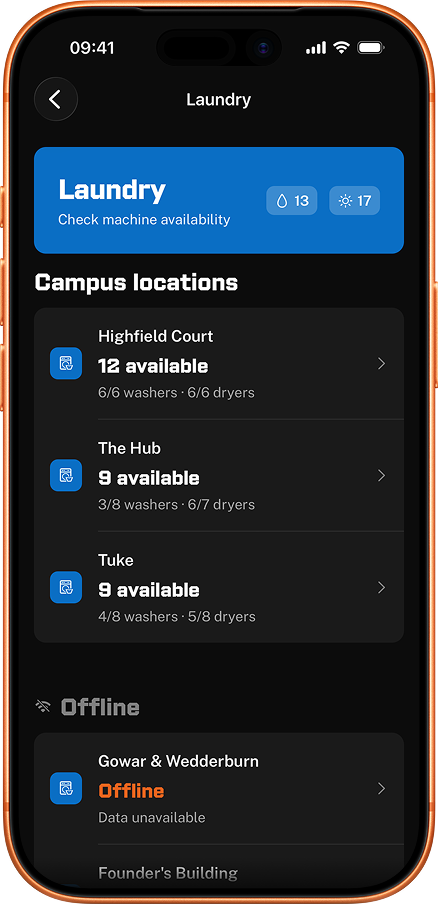 Live bus times, laundry availability, events, food outlets, and a campus map with walking directions. Free forever. No account needed.