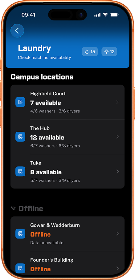 Live bus times, laundry availability, events, food outlets, and a campus map with walking directions. Free forever. No account needed.